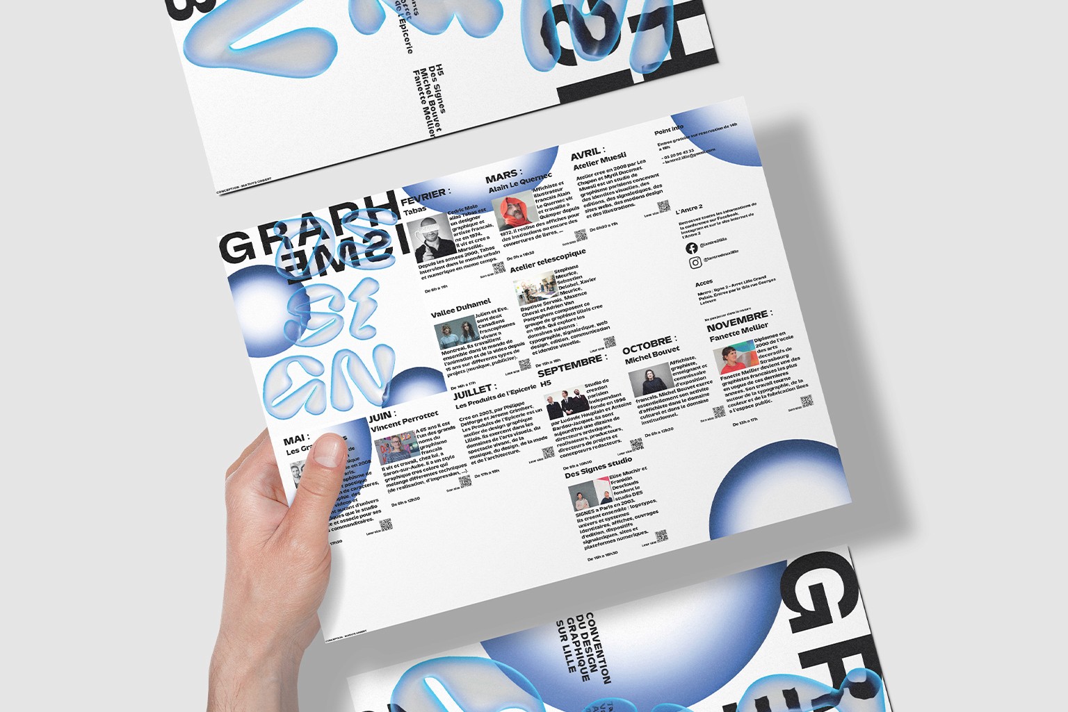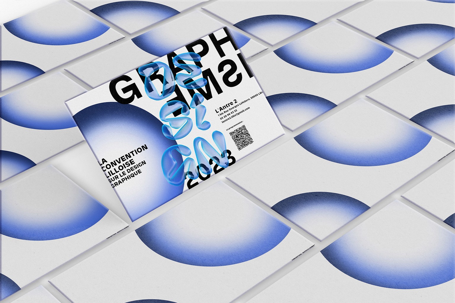 Conçue pour une conférence fictive à Lille, l'identité visuelle de cette convention réunit agences et freelances, talents renommés et artistes émergents, autour de tables rondes dédiées au Design Graphique. Le concept visuel s'appuie sur le mot "DESIGN" placé au centre de l'affiche, dont l'effet de bulle symbolise l'éclosion et l'ascension des créatifs de demain. Le choix d'un bleu clair lumineux assure une visibilité maximale tout en installant une atmosphère sereine et universelle, propice à l'échange et à la transmission entre les générations de passionnés.