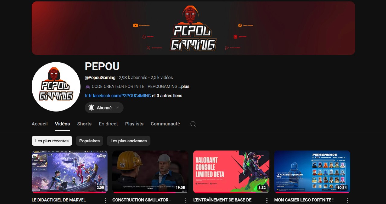 Pour cette première incursion dans l'univers du jeu vidéo, l'identité visuelle de Pepou Gaming a été entièrement repensée à travers un logotype, une bannière et un filigrane au design moderne et dynamique. Le projet s'articule autour d'une mascotte intégrée à une typographie hachurée, dont les coupures créent un rythme visuel propre aux codes du gaming. Le concept d'élévation et de renouveau est subtilement suggéré par des ombres portées circulaires, tandis que la bannière adopte une esthétique épurée au dégradé mystérieux, centrée sur la figure emblématique du masque.