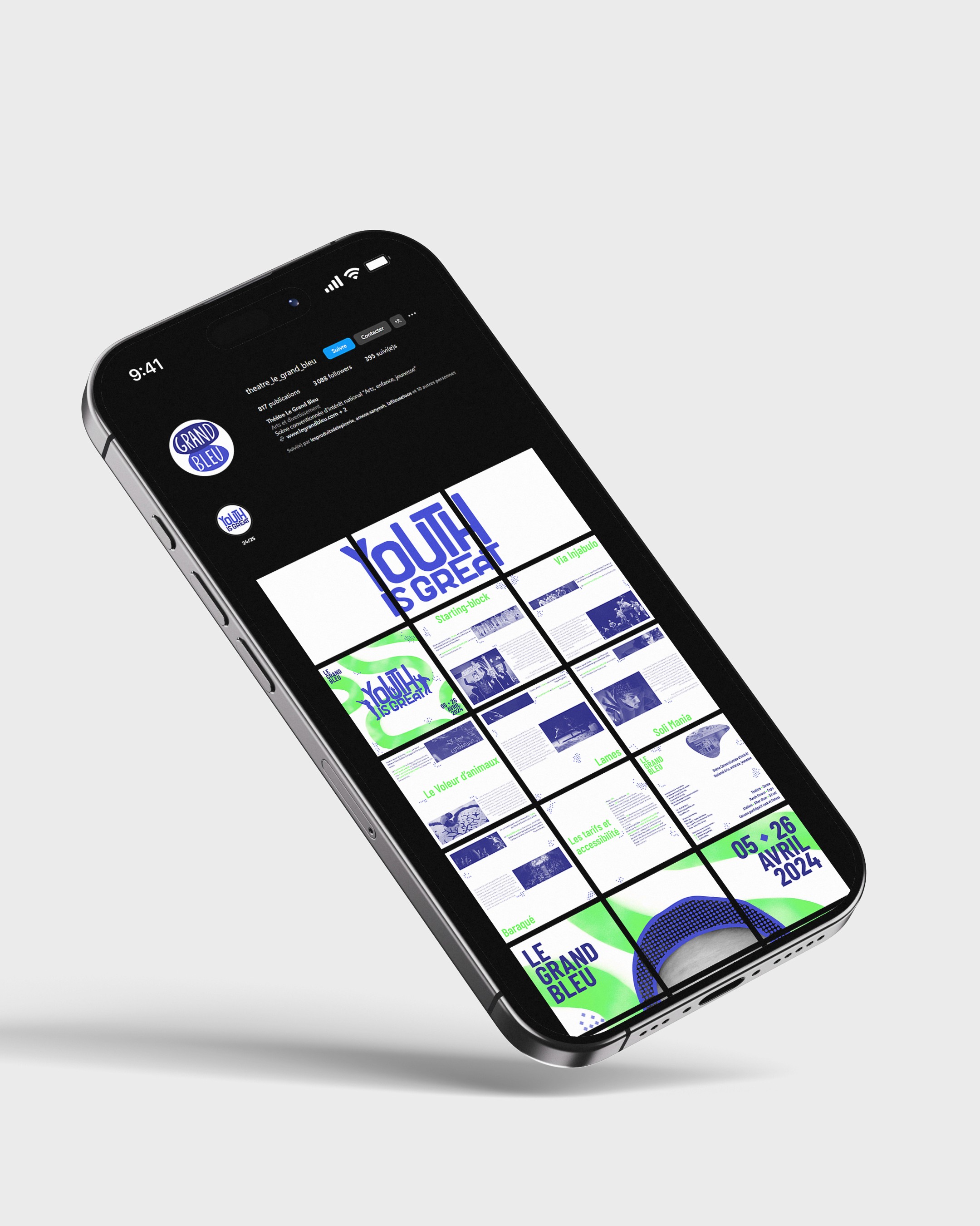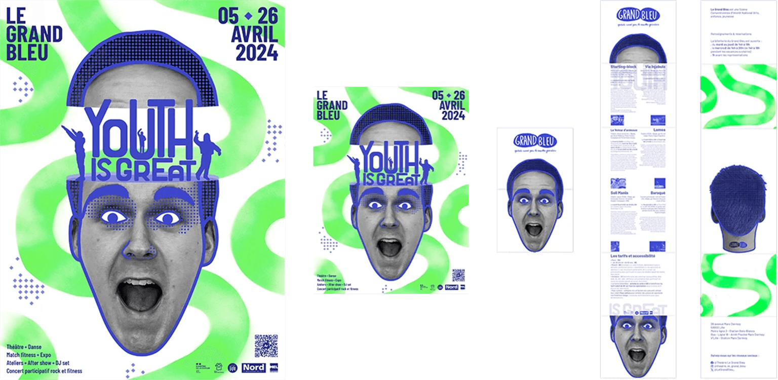 Réalisé pour le Théâtre Le Grand Bleu en collaboration avec Kyllian Mazuard, Samuel Vergé et Tom Zimniewski, ce workshop a donné naissance à l'identité visuelle du festival "Youth Is Great", célébrant l'année olympique. Le projet fusionne sport et ouverture d'esprit théâtrale à travers des supports print et digitaux, s'appuyant notamment sur un photomontage inspiré du travail de Brest Brest Brest pour le Festival d'Aurillac. Techniquement, nous avons mixé impression et pochoir, où des motifs à la bombe vert fluo viennent dynamiser les visuels pour insuffler une esthétique sportive et ludique.